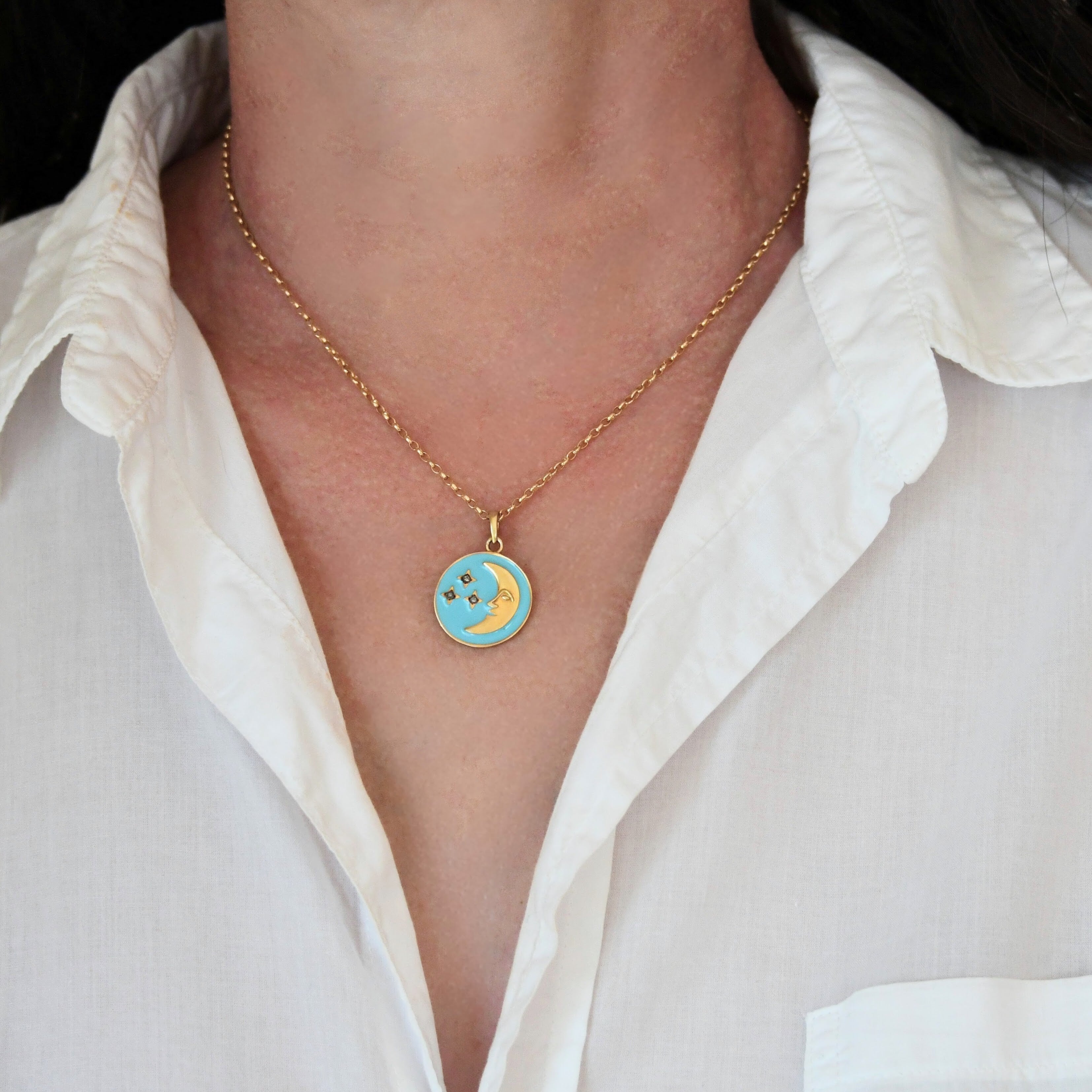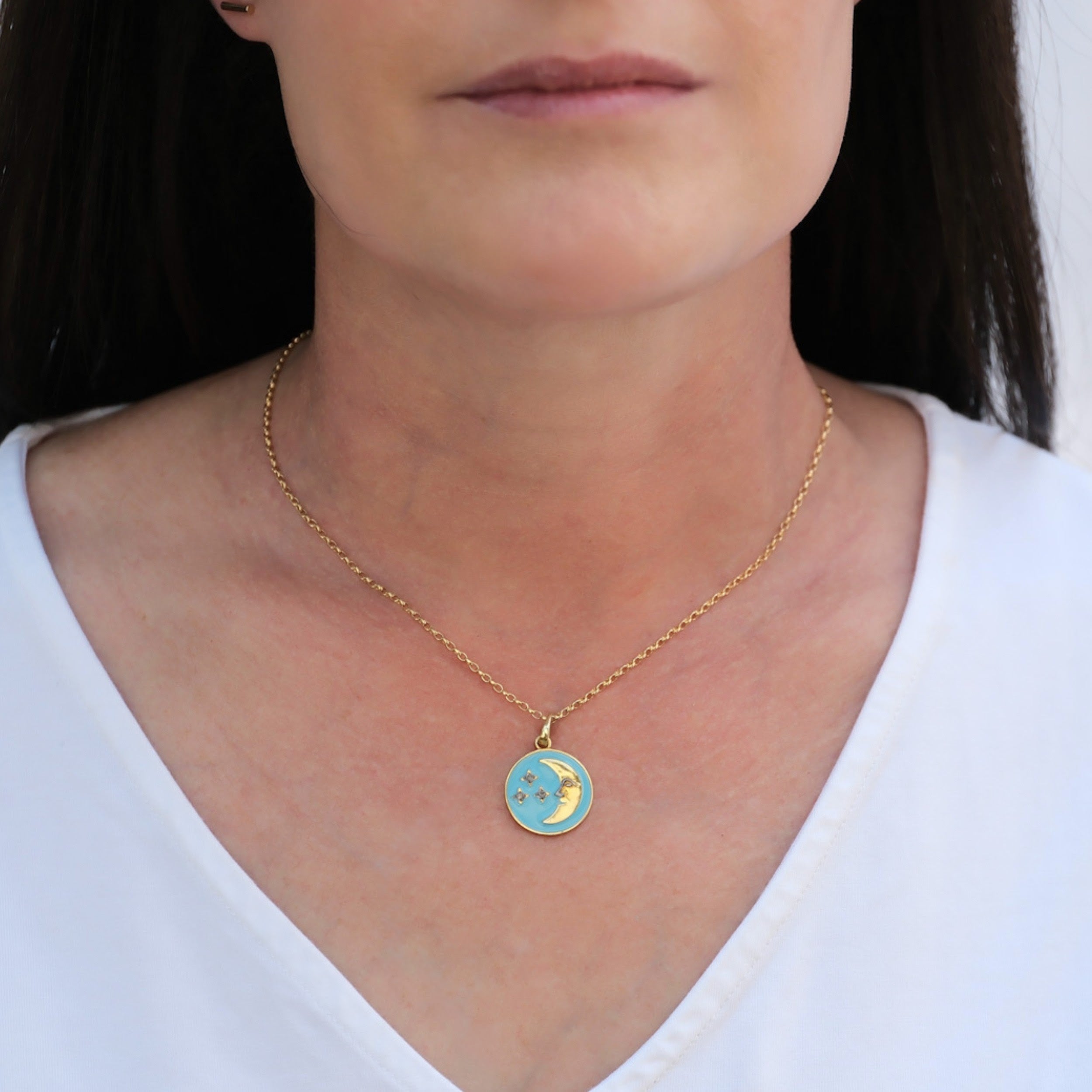 Add a touch of celestial beauty to your everyday look with our Blue Enamel Moon & Stars Pendant Necklace. This stunning piece features a bright blue enamel pendant adorned with a delicate gold vermeil crescent moon and tiny sparkling diamond stars, all suspended from a 14k gold filled chain.