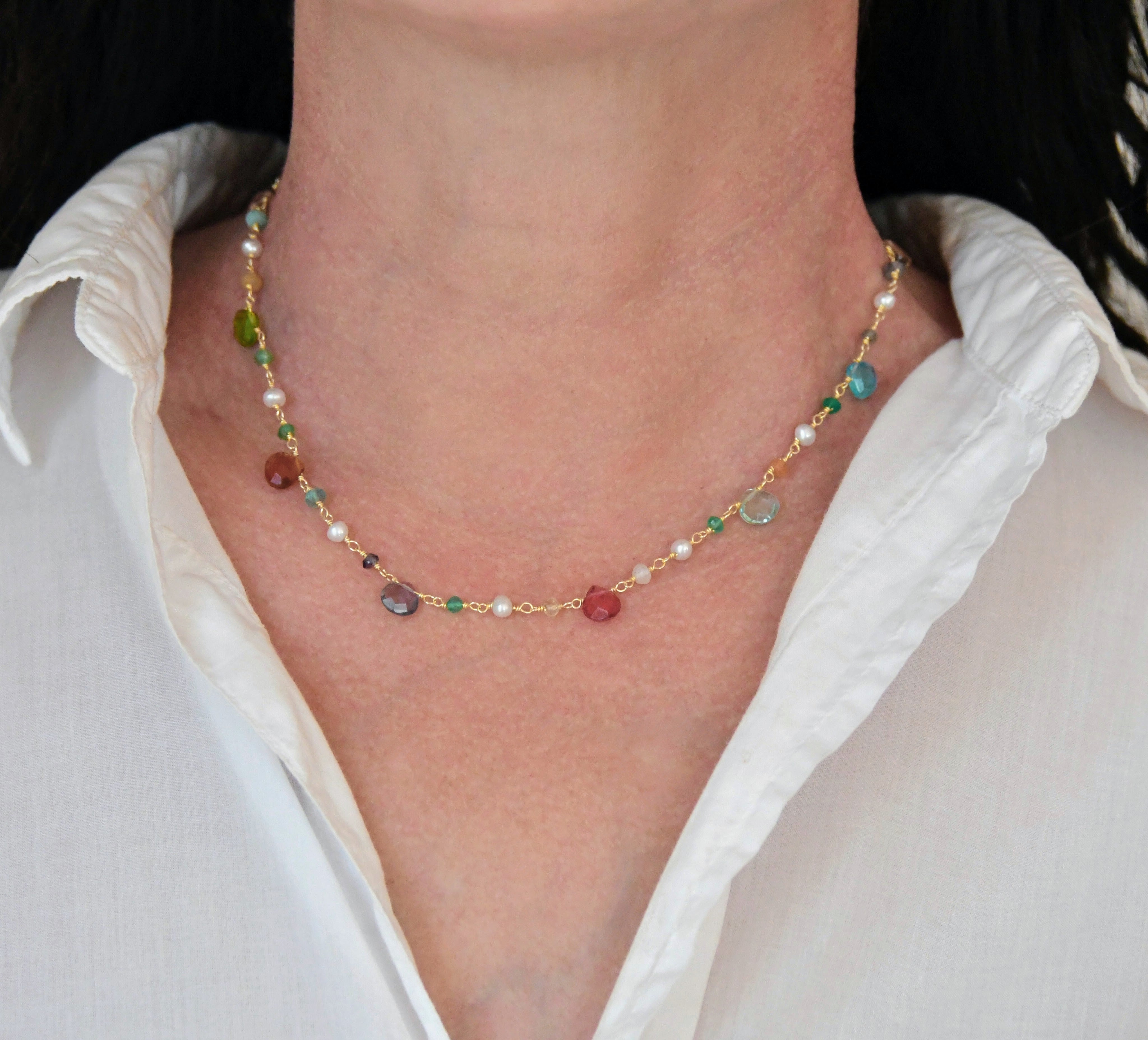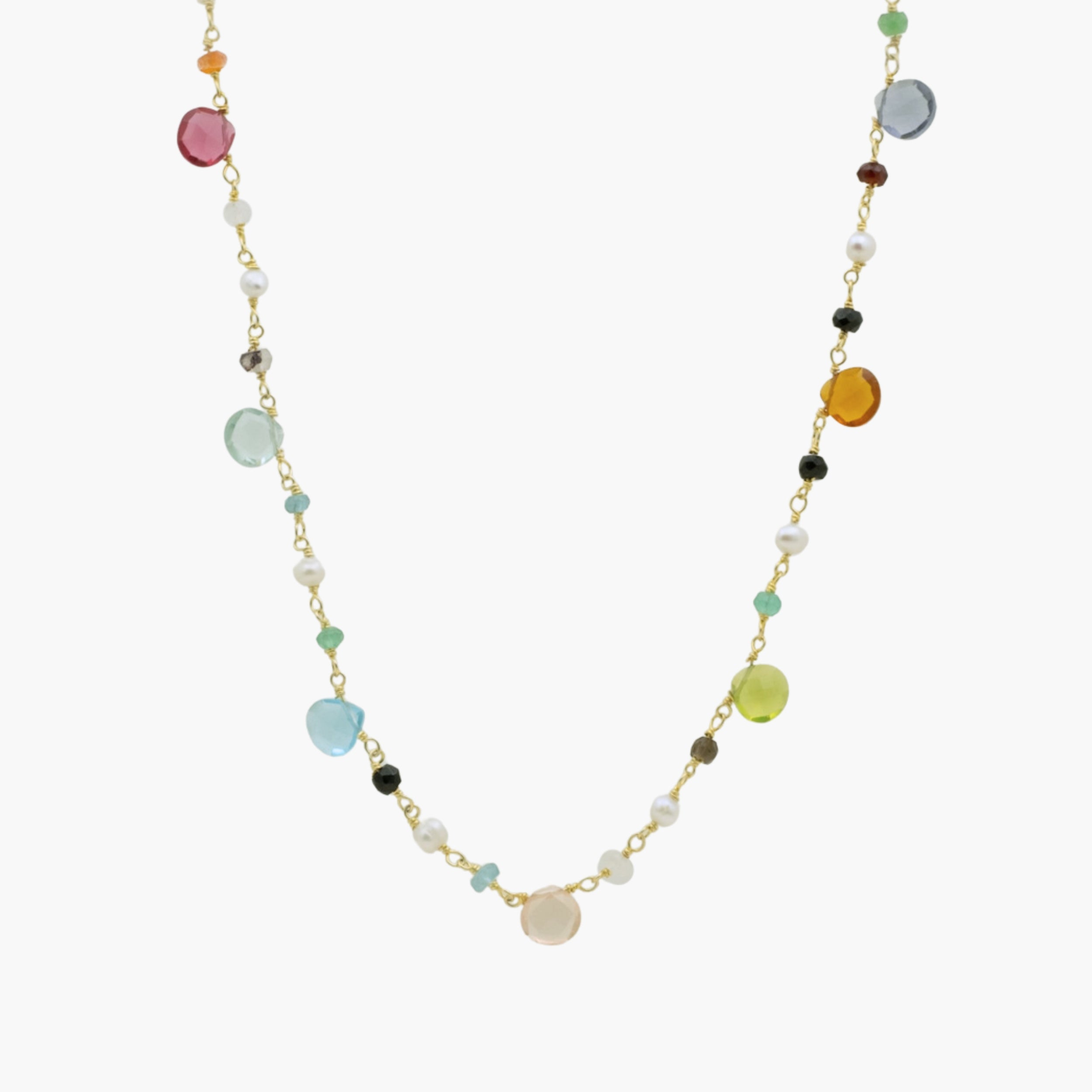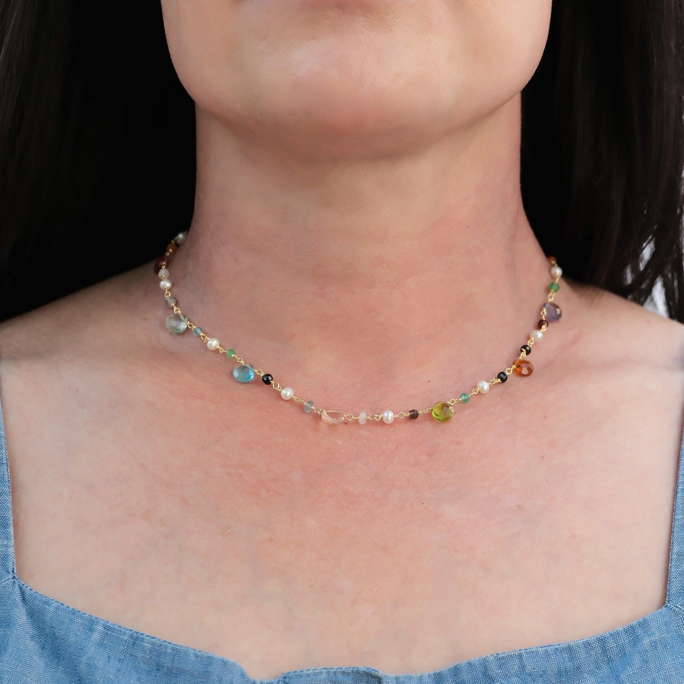 Bring a pop of color and beauty to your everyday style with this wire-wrapped crystal gemstone necklace. Featuring a mix of crystals, gemstones and freshwater pearls, this necklace is eye-catching and elegant. Lightweight and bold, it’s perfect for layering or wearing solo as a statement piece.