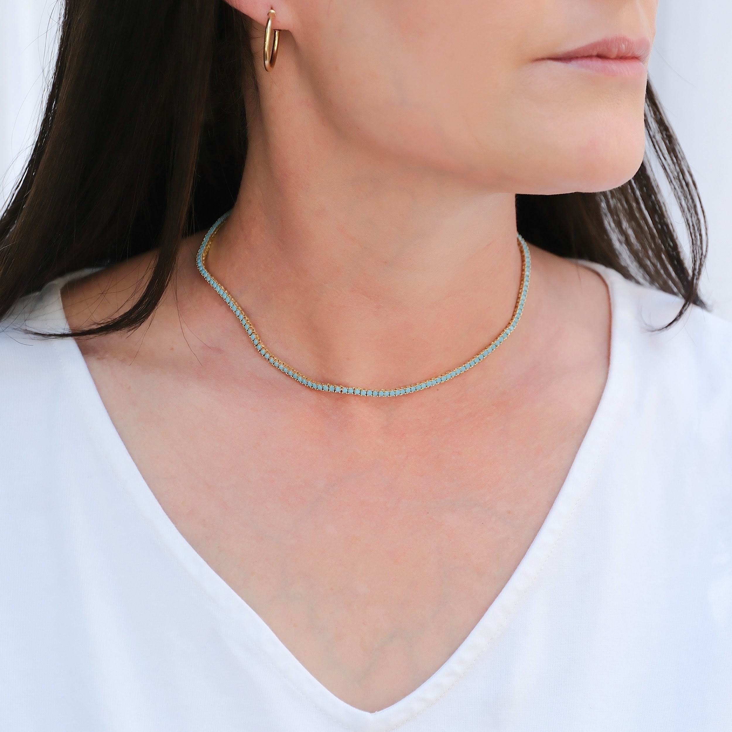 Turn heads with our Turquoise Tennis Choker, a stunning blend of classic style and vibrant color. This eye-catching piece features bright turquoise CZ stones set in a sleek, gold filled design that sits gracefully at your collarbone. Whether you’re layering it with your favorite necklaces or letting it shine solo, this choker adds a pop of color and elegance to any outfit.